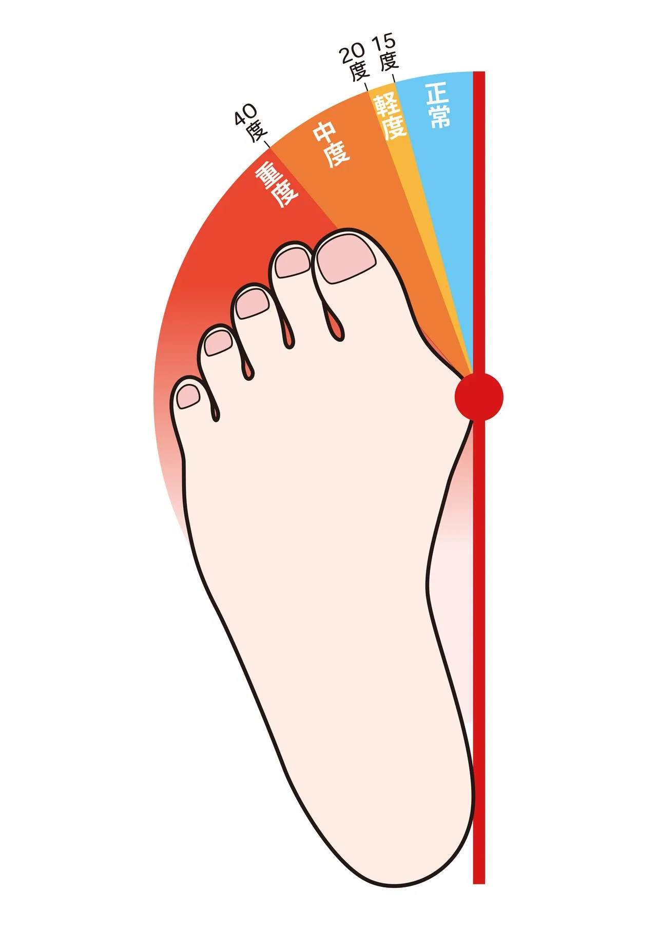 足の親指(母趾)が第二趾側へ15度以上傾き、付け根(第一中足骨頭)が外側に張り出した状態を指します。ヒールや幅の狭い靴で圧迫されると変形が加速し、突出部が靴にこすれて滑液包炎を起こしやすくなります。