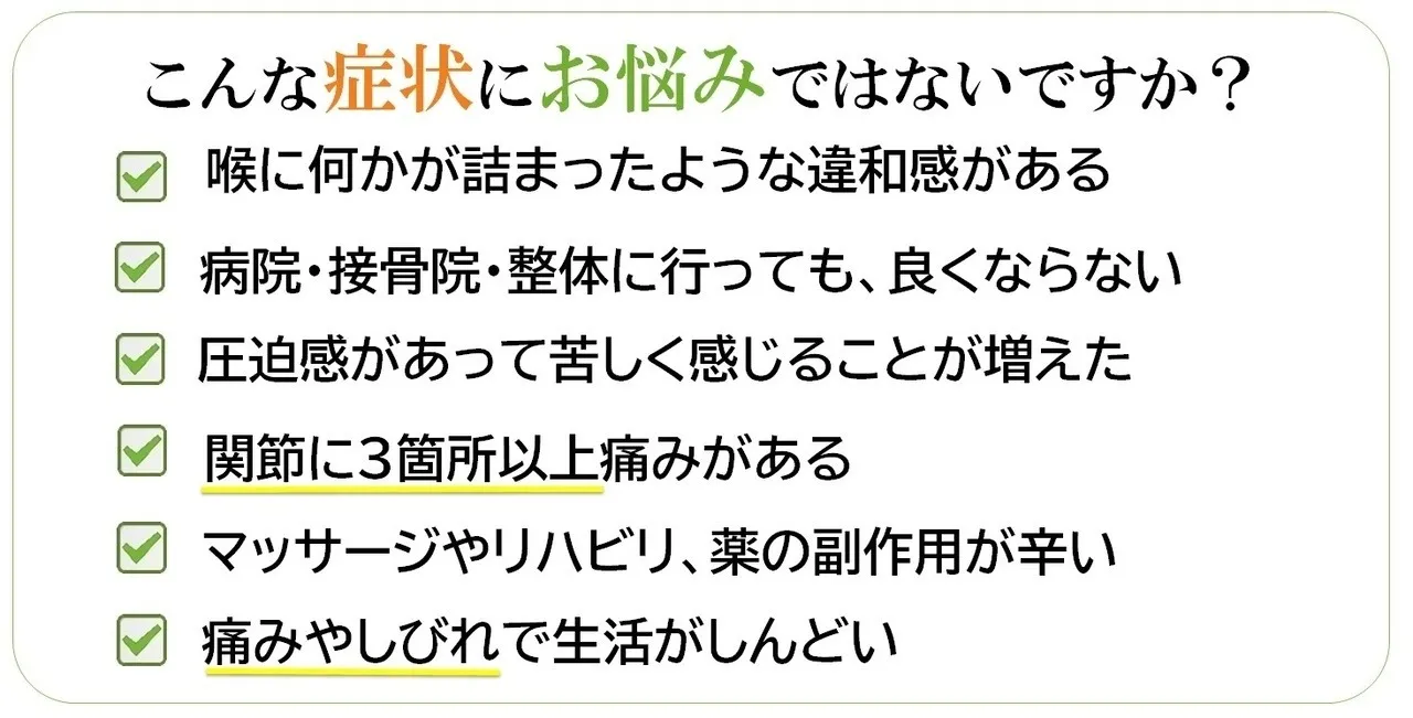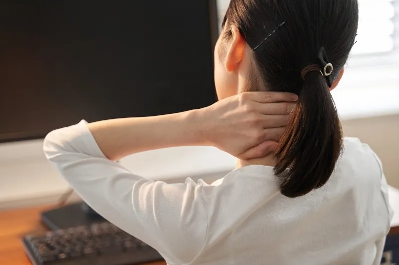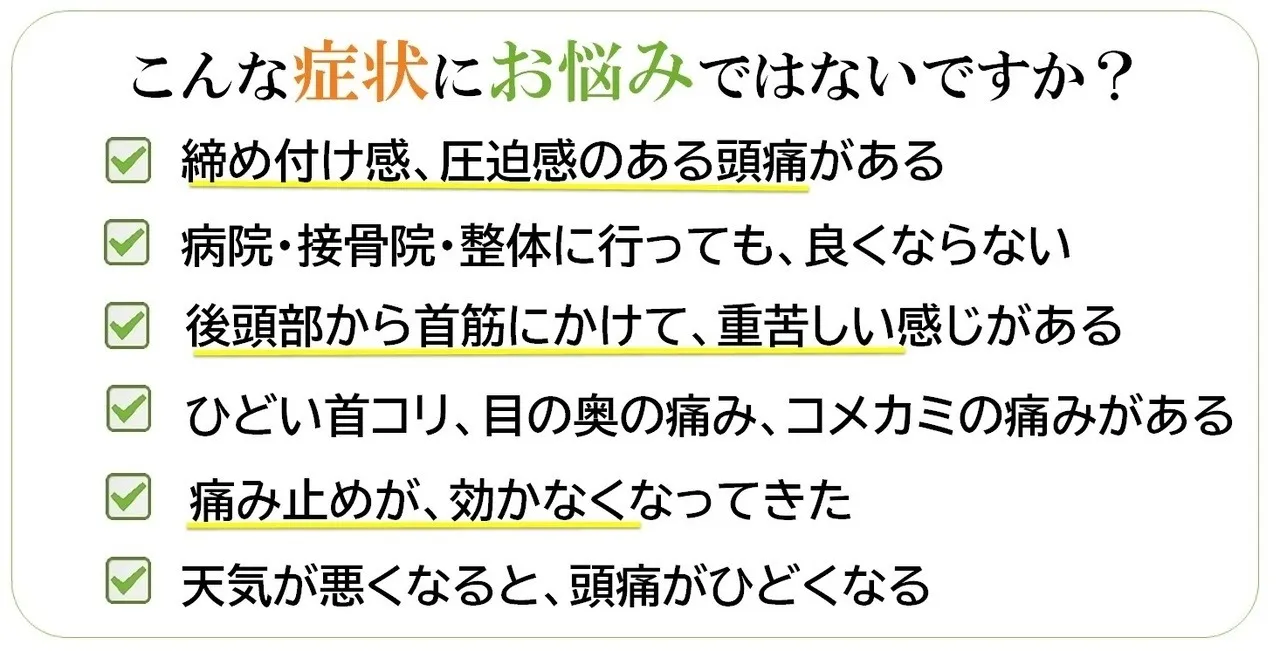 - ひどい首コリ、目の奥の痛み、コメカミの痛みがある