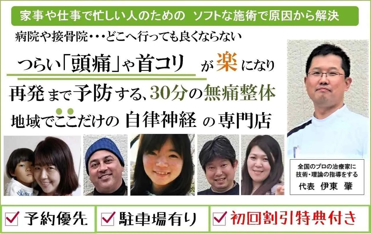 病院で検査をしても異常がない頭痛や顎の痛み、喉のつかえなどは、骨格の歪みや自律神経の乱れが深く関わっているケースもあります。長時間の不良姿勢による肉体的ストレスは、筋肉を緊張させ、全身にあらゆる不調を引き起こします。そこで、独自の整体技術や知識で姿勢を根本から整え、神経の通り道をスムーズにすることで、繰り返す痛みへとアプローチしてまいります。